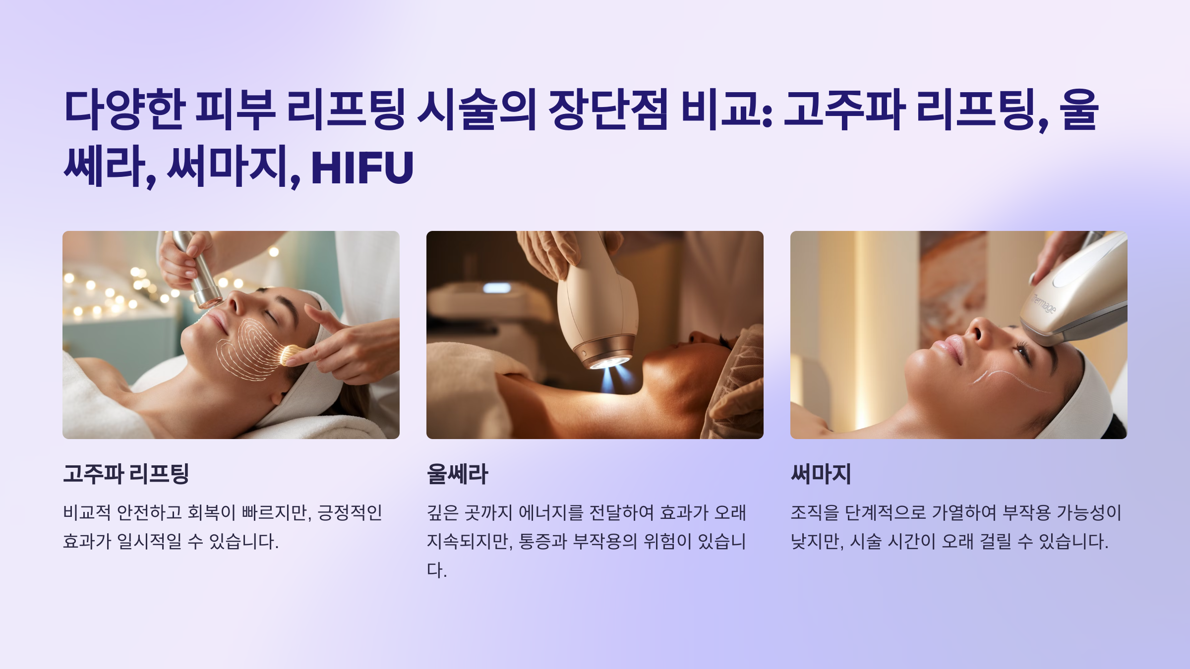 - 시술 후 회복 기간: 빠른 회복을 원할 경우 고주파 리프팅이 적합하며, 지속적인 효과를 기대한다면 울쎄라나 HIFU를 고려해 볼 수 있습니다.