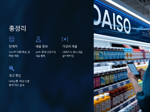 - 온라인 구매: 현재 다이소몰에는 영양제가 등록되지 않았으나, 곧 업데이트될 예정