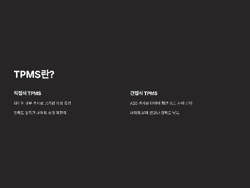 직접식 TPMS | 타이어 내부에 센서를 부착해 공기압을 직접 측정 | 높은 정확도 | 센서 배터리 수명 제한 |